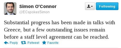 Την επίτευξη σημαντικής προόδου στις συνομιλίες με την Ελλάδα επιβεβαιώνει μέσω του Twitter o Σίμον Ο' Κόνορ, εκπρόσωπος του Ευρωπαίου επιτρόπου αρμόδιου για τις Οικονομικές Υποθέσεις Όλι Ρεν, τονίζοντας όμως ότι υπάρχουν ακόμα εκκρεμή ζητήματα.