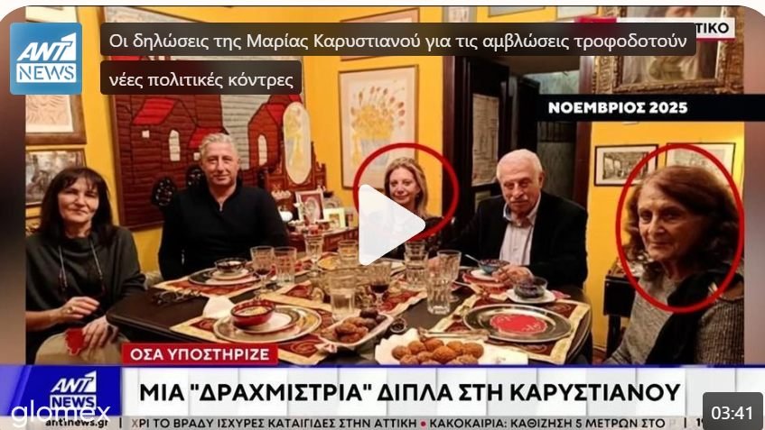 Το δελτίο ειδήσεων του ΑΝΤ1 παρουσίασε χθες την κυρία, αποκαλύπτοντας επιπλέον ότι είναι δραχμίστρια και είχε αγωνιστεί κατά της ΕΕ. Εντόπισε μάλιστα και βίντεο όπου τα έλεγε χαρτί και καλαμάρι. Η «δραχμίστρια» λοιπόν Μαρία Νεγρεπόντη-Δελιβάνη, η οποία δήλωσε στον ΑΝΤ1 ότι θα είναι οικονομική σύμβουλος της Καρυστιανού στο νέο κόμμα, είναι η κυρία που κάθεται δεξιά στο τραπέζι [από γεύμα στο σπίτι της]. Δίπλα της κάθεται ο δημοσιογράφος Παντελής Σαββίδης, πρώην της ΕΡΤ3 και της «Μακεδονίας», ο οποίος έχει στενή σχέση με την Καρυστιανού [παλαιότερα ήταν κολλητός του Κώστα Καραμανλή].