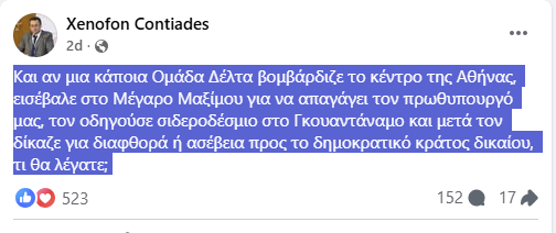 Στην πραγματικότητα, αυτό που εύχονται πολλοί είναι με... δημοκρατικές διαδικασίες ο Μητσοτάκης να οδηγηθεί σιδηροδέσμιος στο Γκουαντάναμο, ώστε να έρθουν αυτοί στα πράγματα. Ο καθηγητής Κοντιάδης, στην παρακάτω ανάρτηση, κάνει μια ατυχή σύγκριση μεταξύ Μαδούρο και Μητσοτάκη, με αιχμές για το κράτος δικαίου - μεταξύ σοβαρού και αστείου για να μην παρεξηγηθεί.