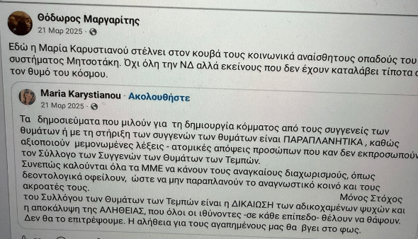 Βέβαια, και ο λόγος της Μαρίας Καρυστιανού είναι... συμβόλαιο, αφού διέψευδε μετά βδελυγμίας τα δημοσιεύματα για δημιουργία νέου κόμματος. Όλοι στην Αριστερά την είχαν πιστέψει, διότι νόμιζαν πως θα την είχαν του χεριού τους. Φυσικά, την πίστεψε και ο... πολιτικός νους Θόδωρος Μαργαρίτης, πρώην ΔΗΜΑΡ, νυν ΠΑΣΟΚ. «Η Μαρία Καρυστιανού στέλνει στον κουβά τους κοινωνικά αναίσθητους οπαδούς του συστήματος Μητσοτάκη» έγραφε όταν η μητέρα των Τεμπών, ψευδώς, ισχυριζόταν ότι δεν ασχολείται με την πολιτική. Με τέτοια διορατικότητα, βλέπω τον Θόδωρο Μαργαρίτη κατάλληλο για να στελεχώσει την «Επιτροπή Σοφών» της Καρυστιανού.