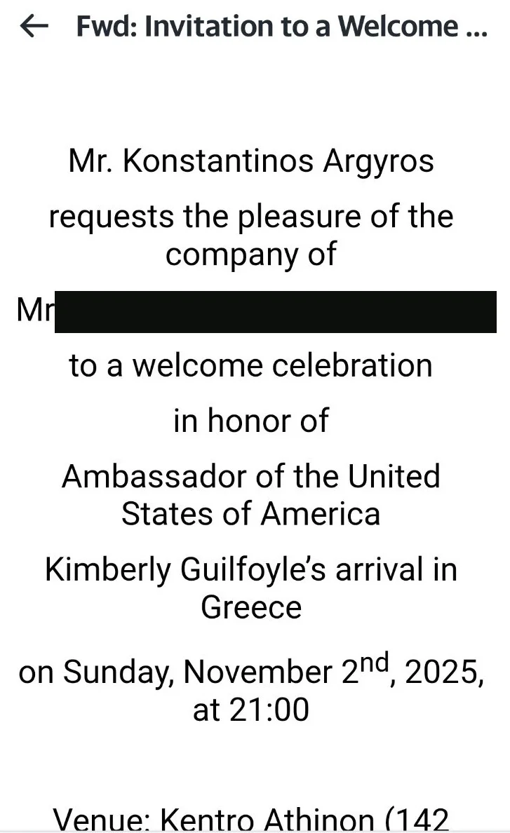 Η πρόσκληση από την κυρία Γκιλφόιλ για τον Αργυρό, όπως φτάνει στα mail των εκλεκτών καλεσμένων της