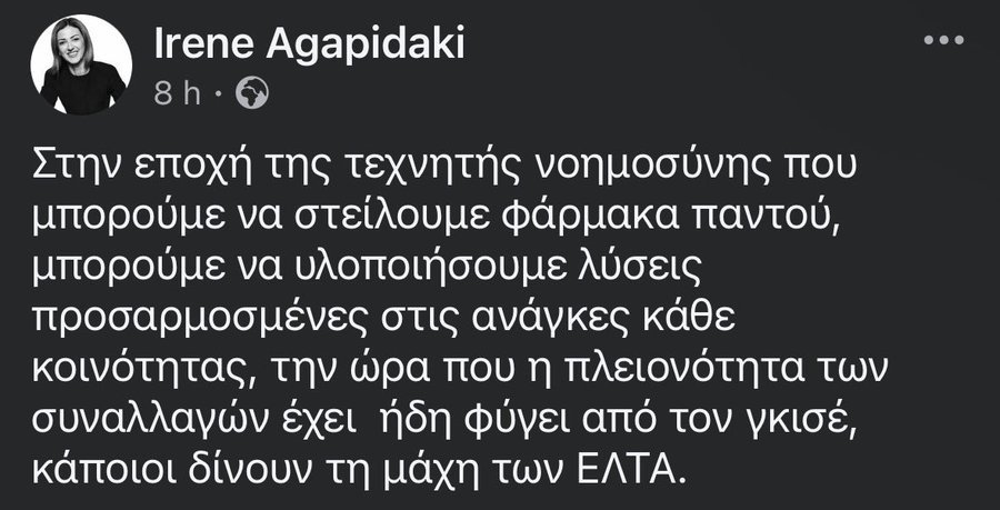 Επίσης, δεν αποφεύχθηκε η παραίτηση του CEO των ΕΛΤΑ Γρηγόρη Σκλήκα, ο οποίος υπέκυψε (κακώς κατά τη γνώμη μου) στην πίεση κυρίως των «γαλάζιων» βουλευτών. Ας μη γελιόμαστε, ο λαϊκισμός και ο κρατισμός καλά κρατούν και στη ΝΔ. Μόνο η αναπληρώτρια υπουργός Υγείας, Ειρήνη Αγαπηδάκη, τόλμησε να μιλήσει υπέρ της μεταρρύθμισης και της εξυγίανσης των ΕΛΤΑ και έπεσαν οι συνάδελφοί της βουλευτές της ΝΔ να τη φάνε. «Ντροπή της», φώναζε ο ένας, «δεν έχει πάρει ψήφο ούτε σε 15μελές» έλεγε ο άλλος. «Ας βγει μια φορά να ζητήσει την ψήφο του κόσμου και ας μιλήσει», σχολίαζε ο τρίτος. Κανονικοί Μαυρογιαλούροι.