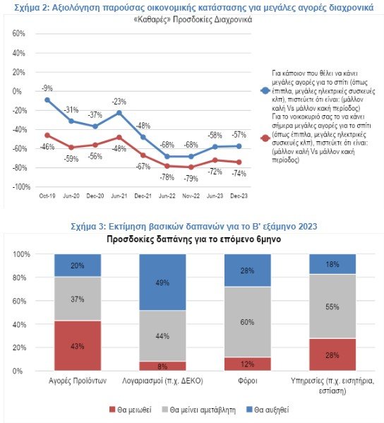 Αντίστοιχα οι προσδοκίες για τις δαπάνες είναι πτωτικές, αλλά σχετίζονται κυρίως με δαπάνες εκτός λιανικών αγορών. Όπως καταγράφεται στο σχήμα 3, το 49% εκτιμά ότι το πρώτο εξάμηνο 2024 οι δαπάνες για λογαριασμούς κοινής ωφέλειας θα είναι αυξημένες. Επίσης, το 43% εκτιμά ότι οι δαπάνες για αγορές προϊόντων το πρώτο εξάμηνο 2024 θα είναι μειωμένες, ενώ μόλις το 20% ότι θα είναι αυξημένες.