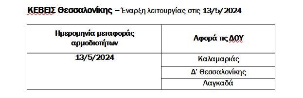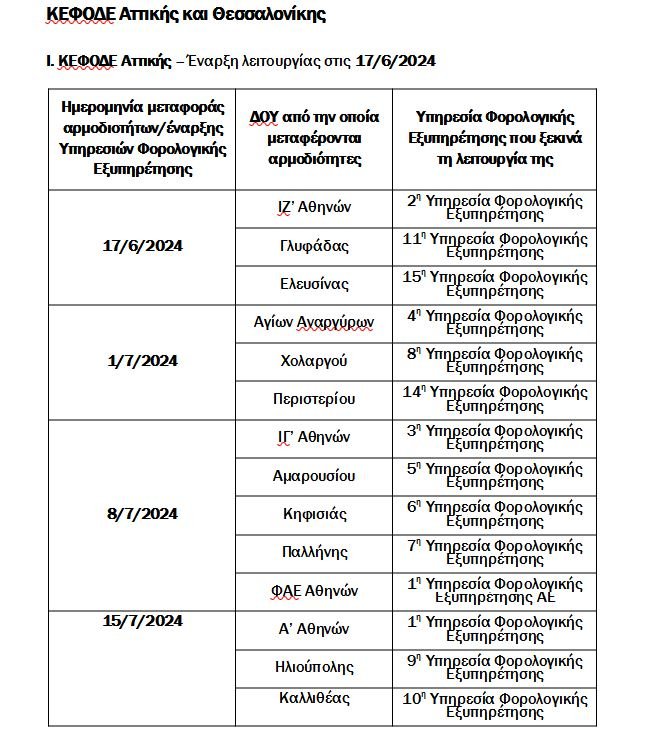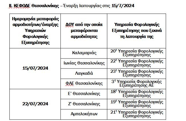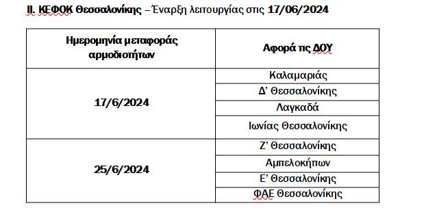 Ταυτόχρονα, οριστικοποιούνται οι ημερομηνίες για την έναρξη λειτουργίας των Κέντρων Φορολογίας Κεφαλαίου (ΚΕΦΟΚ) Αττικής και Θεσσαλονίκης, καθώς και του Κέντρου Βεβαίωσης και Είσπραξης (KEBEIΣ) Θεσσαλονίκης.