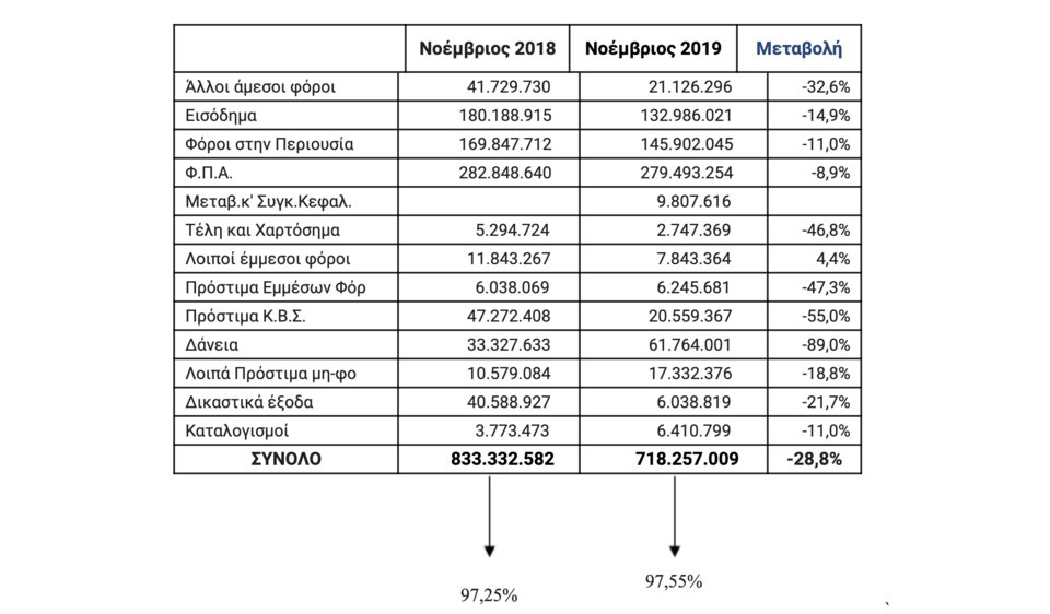 Σε ό,τι αφορά τις εισπράξεις έναντι νέου ληξιπροθέσμου για τον Νοέμβριος (εξαιρουμένων των μη φορολογικών κατηγοριών), έφτασαν τα 336 εκ. (έναντι 326 εκ. την αντίστοιχη περίοδο του 2018) εκ των οποίων το μεγαλύτερο ποσοστό (94%) οφείλεται στις παρακάτω κατηγορίες φόρων: