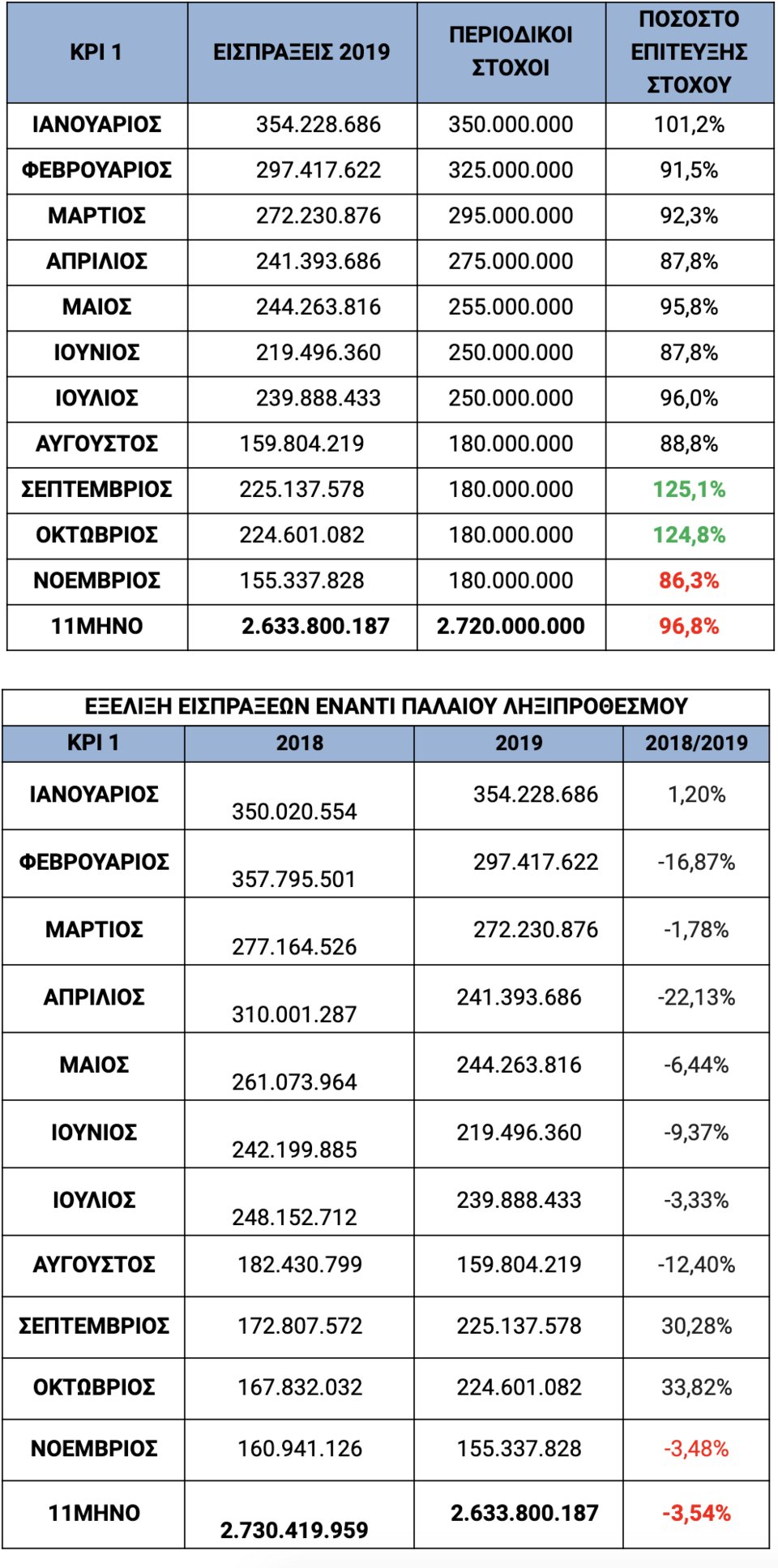 - Για το 11μηνο , το νέο ληξιπρόθεσμο έφτασε τα 6,953 εκ. , ενώ την ίδια περίοδο το 2018 είχε φτάσει τα 9,690 εκ. (μείωση κατά 28,25%).