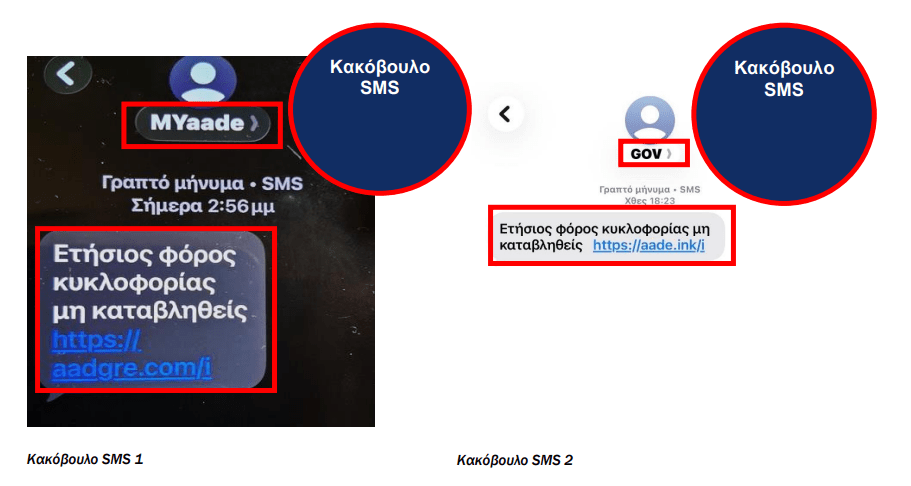 Τα μηνύματα αυτά, με την πρόφαση «μη καταβληθέντος ετήσιου φόρου κυκλοφορίας», ζητούν από τους παραλήπτες να πατήσουν σε σύνδεσμο (link) για να πληρώσουν δήθεν τέλη κυκλοφορίας οχημάτων.