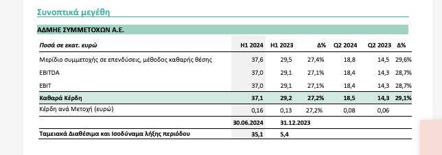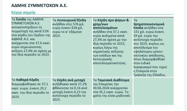 «Το πρώτο εξάμηνο του έτους συνεχίστηκε η θετική πορεία των αποτελεσμάτων της ΑΔΜΗΕ Συμμετοχών, με σημαντική αύξηση των εσόδων κατά 27,4% στα 37,6 εκατ. ευρώ και των κερδών ανά μετοχή στα 0,16 ευρώ, από 0,13 την ίδια περίοδο το 2023, ενώ ο δανεισμός παρέμεινε μηδενικός. Τα έργα του Ομίλου ΑΔΜΗΕ σημείωσαν σημαντική πρόοδο και οι συνολικές επενδύσεις του εξαμήνου ανήλθαν στα 262,3 εκατ. ευρώ.