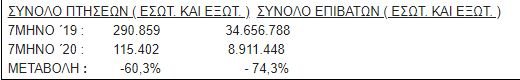 Οσον αφορά τις πτήσεις στα αεροδρόμια της χώρας ανήλθαν στις 115.402, από τις οποίες 67.340 ήταν εσωτερικού και 48.062 εξωτερικού, παρουσιάζοντας πτώση 60,3%, σε σχέση με το αντίστοιχο διάστημα του 2019 όπου είχαν πραγματοποιηθεί 290.859 πτήσεις. Μείωση 72,6% στη συνολική επιβατική κίνηση εμφανίζει και ο Ιούλιος, καθώς διακινήθηκαν 2.7 εκ. επιβάτες. Πτώση 72,5% παρουσιάζεται και στις αφίξεις επιβατών εξωτερικού.
