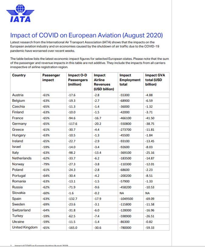 «Η βραχυπρόθεσμη προοπτική ανάκαμψης στην Ευρώπη παραμένει εξαιρετικά αβέβαιη, λαμβάνοντας υπ' όψιν το δεύτερο κύμα της πανδημίας και τις ευρύτερες οικονομικές επιπτώσεις που μπορεί να έχει», επισημαίνει η ΙΑΤΑ, συμπληρώνοντας ότι η επιβατική κίνηση δεν αναμένεται να επιστρέψει στα επίπεδα του 2019 πριν από το 2024.