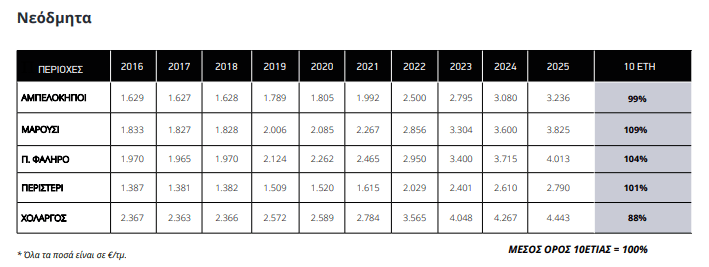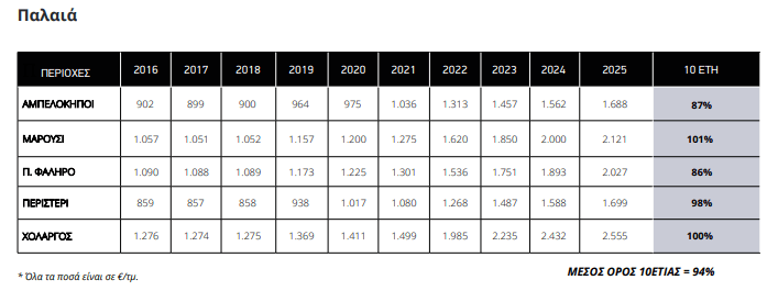 Αποκαλυπτικά είναι, μάλιστα, τα στοιχεία αν ανατρέξει κανείς σε βάθος δεκαετίας, καθώς φαίνεται πως υπάρχει αύξηση κατά μέσο όρο 100% στα νεόδμητα και 94% στα παλαιότερα διαμερίσματα σε σχέση με τις αξίες του 2016!!! Ενδεικτικά, ένα παλιό διαμέρισμα στο Μαρούσι, με τιμή 1.057 ευρώ/τ.μ. το 2016, έφτασε στα 2.121 ευρώ/τ.μ. το 2025. Όσο για τα νεόδμητα, μια τυπική κατοικία στο Π. Φάληρο εκτινάχθηκε από τα 1.970 ευρώ/τ.μ. στα 4.013 ευρώ/τ.μ.!