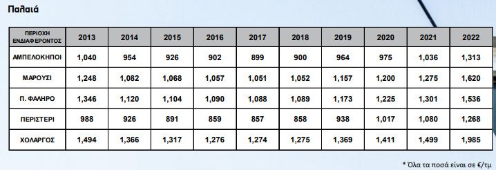 - στο Παλαιό Φάληρο (2.950 ευρώ/τμ από 2.465 ευρώ/τμ με ετήσια άνοδο 19,68%),