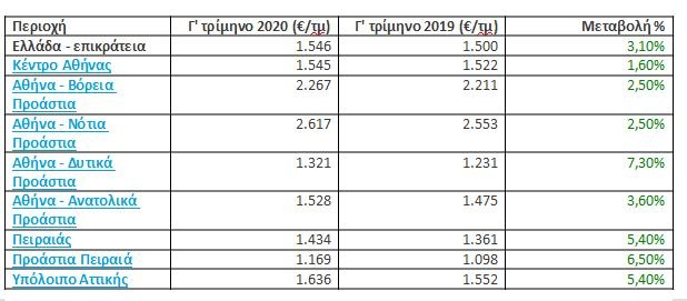 Τα στοιχεία από την αγορά δείχνουν ότι η άνοδος συνεχίστηκε και το επόμενο τρίμηνο, παρά το μούδιασμα και την αβεβαιότητα που έσπειρε ο κορωνοϊός. Σύμφωνα με τα στοιχεία του spitogatos.gr, οι τιμές ανέβηκαν 3,1% κατά μέσο όρο στην Επικράτεια, ωστόσο μια προσεκτική ματιά δείχνει ότι καταγράφονται μεγάλες διακυμάνσεις ανά περιοχή, που προφανώς σχετίζονται με την ισορροπία προσφοράς- ζήτησης.