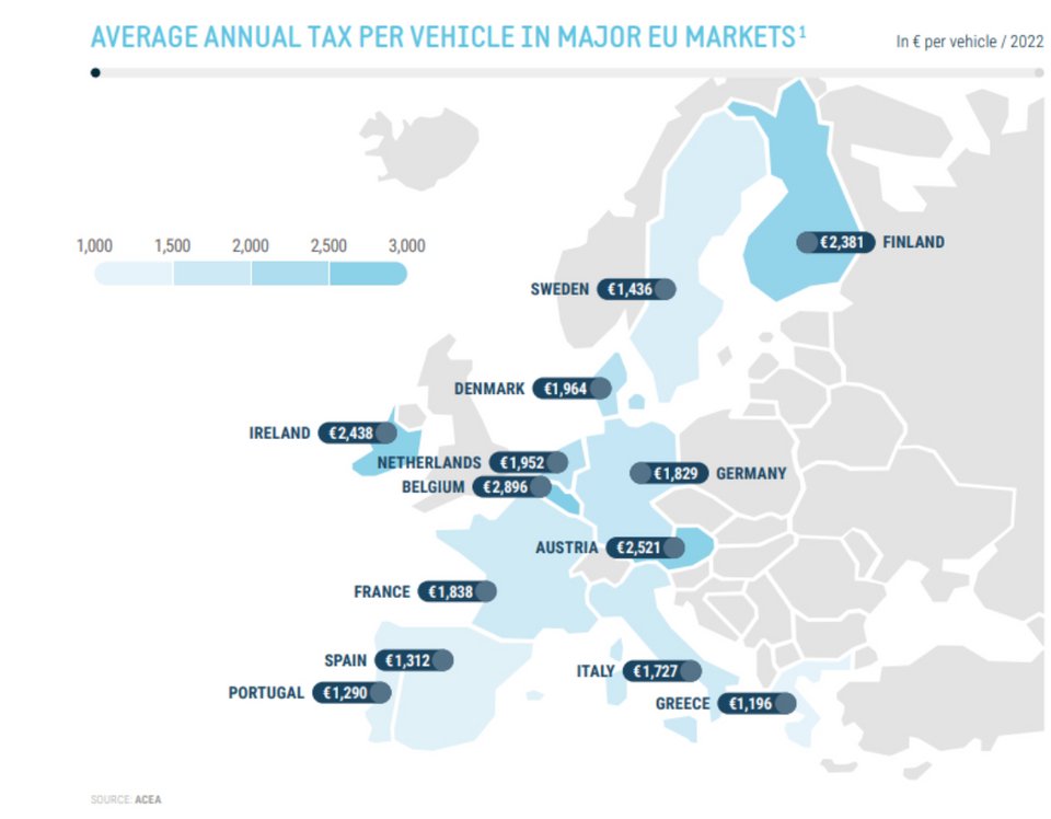 Δεκατέσσερις από αυτές τις χώρες (Αυστρία, Βέλγιο, Δανία, Φινλανδία, Γαλλία, Ελλάδα, Ισλανδία, Ιρλανδία, Ιταλία, Κάτω Χώρες, Νορβηγία, Πορτογαλία, Σλοβενία και Σουηδία) εφαρμόζουν τέτοια διαφοροποίηση τόσο για τους φόρους αγοράς/εγγραφής όσο και για τους περιοδικούς φόρους. Η Νορβηγία, κατήργησε, πάντως, την απαλλαγή από τα τέλη κυκλοφορίας για τα ηλεκτροκίνητα οχήματα από την 1η Μαρτίου 2022.