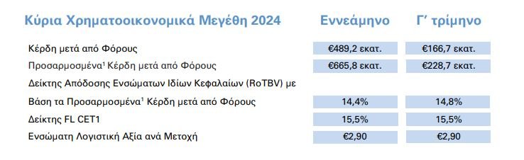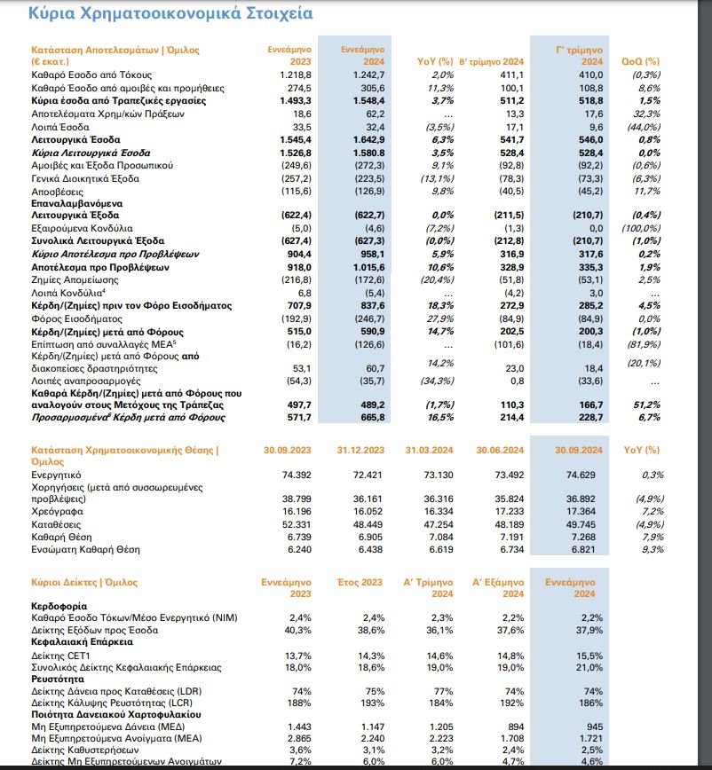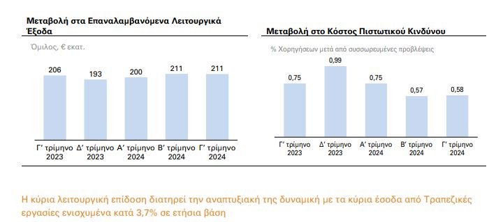 Τον Οκτώβριο 2024, η Τράπεζα ολοκλήρωσε Πρόγραμμα Εθελουσίας Εξόδου Προσωπικού (VSS) με εκτιμώμενο κόστος €44,3 εκατ. (περιλαμβάνεται στις «Λοιπές αναπροσαρμογές» της περιόδου), το οποίο αναμένεται να οδηγήσει σε σταδιακή αποχώρηση περίπου 480 εργαζομένων, επιτρέποντας την υλοποίηση του στρατηγικού σχεδίου, με την ανάπτυξη του νέου λειτουργικού μοντέλου στο Retail, ενισχύοντας περαιτέρω τη λειτουργική αποδοτικότητα. Το Κόστος Πιστωτικού Κινδύνου ανήλθε σε 58 μονάδες βάσης Σε οργανικό επίπεδο, οι Ζημίες Απομείωσης για την κάλυψη πιστωτικού κινδύνου δανείων ανήλθαν σε €29,5 εκατ. ή 32 μονάδες βάσης το γ’ τρίμηνο 2024, έναντι €28,3 εκατ. το προηγούμενο τρίμηνο.