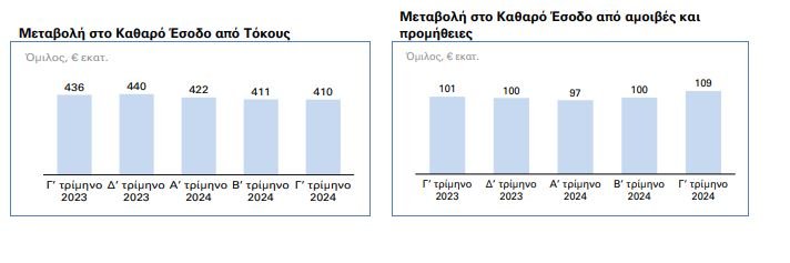 Το γ’ τρίμηνο 2024, το Καθαρό Έσοδο Τόκων ανήλθε σε €410 εκατ. μειωμένο κατά 0,3% σε τριμηνιαία βάση. Η επίδοση του τριμήνου επηρεάστηκε θετικά κατά €4 εκατ., από το μεγαλύτερο ημερολογιακά τρίμηνο.