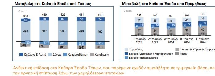 • Σχεδόν αμετάβλητο Καθαρό Έσοδο Τόκων (-0,3% σε τριμηνιαία βάση) ύψους €410 εκατ., καθώς η χαμηλότερη συνεισφορά των δανείων αντισταθμίστηκε από τη θετική συνεισφορά του χαρτοφυλακίου ομολόγων καθώς και το χαμηλότερο κόστος χρηματοδότησης. Το Εννεάμηνο 2024, το Καθαρό έσοδο Τόκων ενισχύθηκε κατά 2% σε ετήσια βάση.