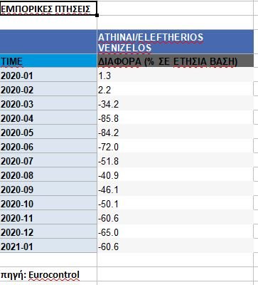 Την ίδια στιγμή, στοιχεία από την Eurostat, το Eurocontrol και την ΙΑΤΑ, συνθέτουν την εικόνα χάους στις αερομεταφορές και κατ’ επέκταση στον Τουρισμό. Ακόμα και μετά το απόλυτο lockdown της περσινής Άνοιξης, που προκάλεσε μείωση άνω του 90% στις εμπορικές πτήσεις πανευρωπαϊκά, οι αριθμοί είναι απογοητευτικοί, αφού το δεύτερο κύμα κι εν συνεχεία το τρίτο κύμα της πανδημίας, έφεραν νέους περιορισμούς στις μετακινήσεις. Είναι ενδεικτικό ότι ο φετινός Ιανουάριος έκλεισε με πτώση 68,1%. Ειδικά όσον αφορά στο «Ελευθέριος Βενιζέλος», η μείωση ξεπέρασε το 60%.