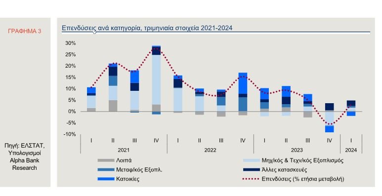 Οι επενδύσεις, δηλαδή ο ακαθάριστος σχηματισμός παγίου κεφαλαίου αυξήθηκαν κατά 2,9% σε ετήσια βάση το πρώτο τρίμηνο του 2024, συμβάλλοντας στην άνοδο του ΑΕΠ κατά 0,4 π.μ. (ποσοστιαίες μονάδες).