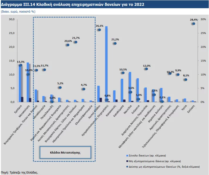 Τα υψηλότερα ποσοστά Μη Εξυπηρετούμενων Δανείων καταγράφονται στους κλάδους της εστίασης (28,4%), των κατασκευών (21,2%), του εμπορίου (13,3%), της διαχείρισης ακίνητης περιουσίας (12%), των καταλυμάτων (10,5%), των αγροτικών δραστηριοτήτων (10,3%) και της μεταποίησης (10%). Υψηλά ποσοστά καταγράφονται και σε επιμέρους κλάδους της μεταποίησης, όπως ο κλάδος της κλωστοϋφαντουργίας (30,3%), της βιομηχανίας χάρτου, ξύλου και επίπλων (21,7%) και των λοιπών μεταποιητικών δραστηριοτήτων (20,6%), τα οποία όμως αφορούν μικρότερα υπόλοιπα χορηγήσεων και συνεπώς έχουν μικρή επίδραση στη διαμόρφωση του συνολικού δείκτη ΜΕΔ του κλάδου της μεταποίησης.