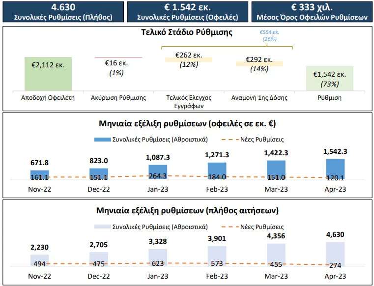 - Οι συνολικές ρυθμίσεις οφειλών που έχουν πραγματοποιηθεί, μέχρι και το τέλος Απριλίου του 2023, ανέρχονται σε 4.630 (+274 σε σχέση με το τέλος Μαρτίου), οι οποίες αντιστοιχούν σε 1,54 δισ. ευρώ αρχικών οφειλών. Σημειωτέον ότι το σύνολο των οφειλών, που βρίσκονται εντός Εξωδικαστικού, είναι 18,1 δισ ευρώ