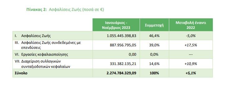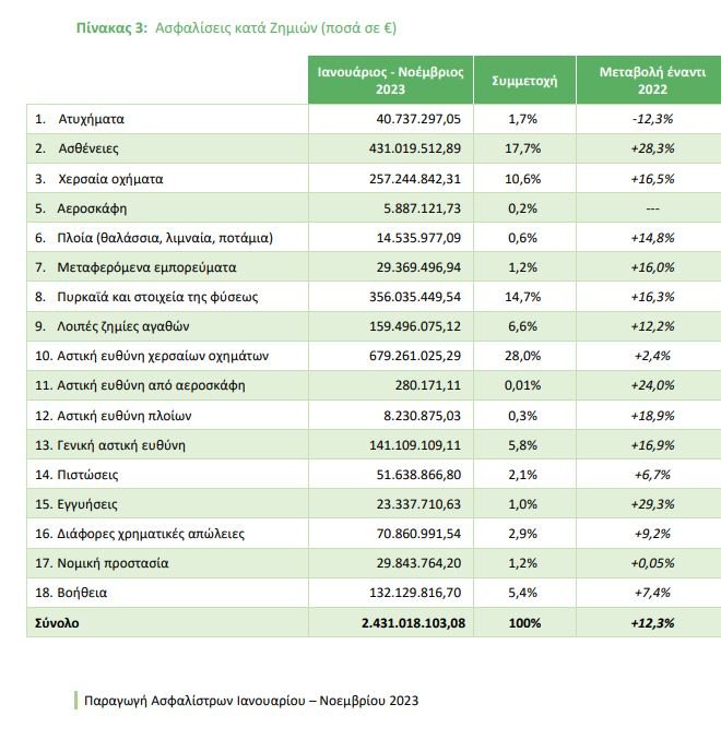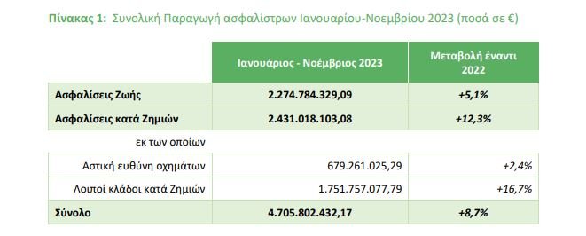 Σύμφωνα με τα στοιχεία αυτά (κατόπιν προσαρμογής των δεδομένων του προηγούμενου χρονικού διαστήματος με νεότερες απαντήσεις), από τη σύγκριση των δηλώσεων παραγωγής ασφαλίστρων των μηνών Ιανουαρίου - Νοεμβρίου 2023 των ανωτέρω επιχειρήσεων με τις αντίστοιχες της ίδιας περιόδου για το 2022 των ιδίων επιχειρήσεων, προκύπτουν τα παρακάτω: