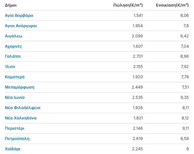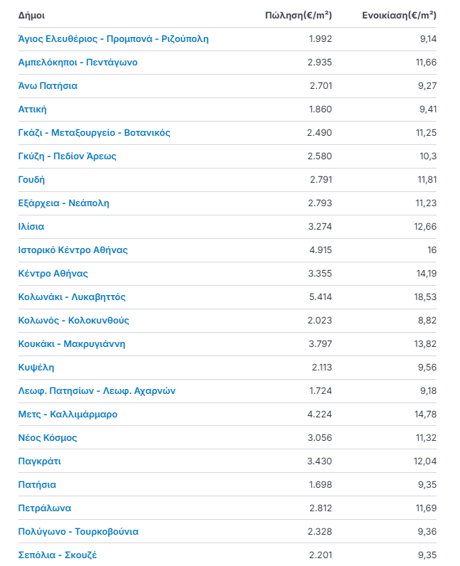 | Περιοχή | Γ' τρίμηνο 2025 (€/τμ) | Γ' τρίμηνο 2024 (€/τμ) | Μεταβολή % |