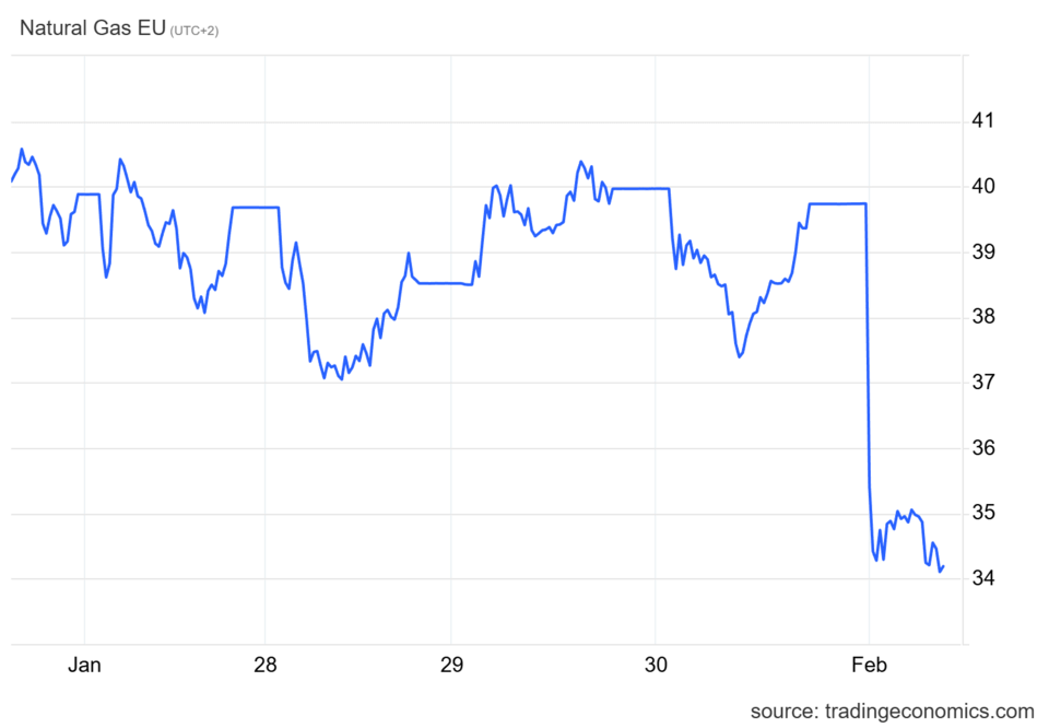 Αυτή την ώρα η τιμή του φυσικού αερίου καταγράφει απώλειες πάνω από 13%, στα περίπου 34,11 ευρώ/MWh, υποχωρώντας από το υψηλό επτάμηνου των 40 ευρώ που σημειώθηκε στις 23 Ιανουαρίου, καθώς οι ανησυχίες για την προσφορά LNG μειώθηκαν.