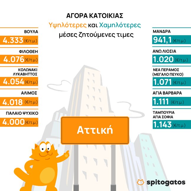 Σύμφωνα με τα στοιχεία του spitogatos.gr, το γ’ τρίμηνο η υψηλότερη μέση ζητούμενη τιμή πώλησης σημειώθηκε στα Νότια (3.167 €/τ.μ.) και Βόρεια (2.628 €/τ.μ.) προάστια της Αθήνας και τις Κυκλάδες (2.963 €/τ.μ.), περιοχές που ήδη από το α’ εξάμηνο της φετινής χρονιάς είχαν εντοπισθεί ψηλά στις αναζητήσεις του αγοραστικού κοινού από χώρες του εξωτερικού.