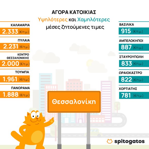 Οι περιοχές με τη μεγαλύτερη μεταβολή τιμής κατοικιών προς πώληση βρίσκονται στον Δήμο Θεσσαλονίκης. Συγκεκριμένα, η μεγαλύτερη αύξηση μέσης ζητούμενης τιμής πώλησης κατοικίας στη Θεσσαλονίκη, για το γ’ τρίμηνο του 2022, εντοπίζεται σε Τούμπα (1.961 €/τ.μ.) και Βούλγαρη – Ντέπω – Μαρτίου (1.844 €/τ.μ.), ενώ ακολουθούν η Νεάπολη (960 €/τ.μ.), το Φάληρο - Ιπποκράτειο (1.719 €/τ.μ.) και η Θέρμη (1.732 €/τ.μ.) στα προάστια της πόλης.