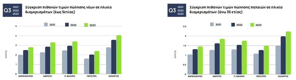 Στα νέα σε ηλικία διαμερίσματα, μέσης επιφανείας 95 τ.μ., διάμεσης ηλικίας μόλις 2 ετών και 1ου ορόφου, η έρευνα αγοράς οδήγησε στο συμπέρασμα ότι οι υψηλότερες αξίες καταγράφονται στον Χολαργό (4.048 ευρώ/τ.μ. από 3.565 ευρώ/τ.μ., με ετήσια άνοδο 13,55%) και εν συνεχεία κατά σειρά στην περιοχή του Παλαιού Φαλήρου (3.400 ευρώ/τ.μ. από 2.950 ευρώ/τ.μ., με ετήσια άνοδο 15,25%), στο Μαρούσι (3.304 ευρώ/τ.μ. από 2.856 ευρώ/τ.μ., με ετήσια άνοδο 15,69%), στους Αμπελόκηπους (2.795 ευρώ/τ.μ. από 2.500 ευρώ/τ.μ., με ετήσια άνοδο 11,80%) και, τέλος, στο Περιστέρι (2.401ευρώ/τ.μ. από 2.029 ευρώ/τ.μ., με ετήσια άνοδο 18,33%).