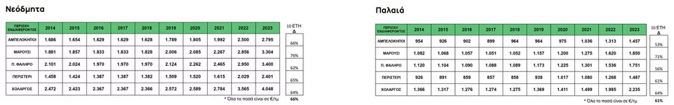 Η έντονα ανοδική τάση καταγράφεται από το 2019 και η «έκρηξη» γίνεται ειδικά κατά τη φετινή χρονιά. Το ρεκόρ αύξησης έχει το Μαρούσι, τόσο στα νεόδμητα όσο και στα παλαιότερα διαμερίσματα. Είναι ενδεικτικό ότι ένα νεόδμητο το 2014 πωλούνταν προς 1.881 ευρώ/τ.μ., το 2022 πήρε πάνω σχεδόν 1.000 ευρώ και το 2023 έφτασε στα 3.304 ευρώ/τ.μ. Με λίγα λόγια, προκύπτει αύξηση 76% σε αυτή τη δεκαετία!