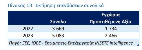 Βάσει των παραπάνω, το σύνολο της επενδυτικής δραστηριότητας του τουρισμού για το 2022 ανέρχεται στα € 3.669 εκ. εκ των οποίων € 1.734 εκ. αφορούν σε δαπάνη εγχώριας προστιθέμενης αξίας. Τα αντίστοιχα μεγέθη για το 2023 είναι € 5.083 εκ. και € 2.466 εκ., παρουσιάζοντας αύξηση +39% και +42% αντίστοιχα.