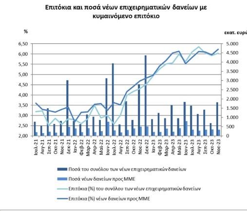 Το μέσο επιτόκιο των νέων επιχειρηματικών δανείων με συγκεκριμένη διάρκεια και κυμαινόμενο επιτόκιο αυξήθηκε κατά 11 μονάδες βάσης, το Νοέμβριο του 2023, και διαμορφώθηκε στο 6,04%. Το μέσο επιτόκιο των δανείων τακτής λήξης με κυμαινόμενο επιτόκιο προς μικρομεσαίες επιχειρήσεις (ΜΜΕ) αυξήθηκε κατά 26 μονάδες βάσης και διαμορφώθηκε στο 6,23%.