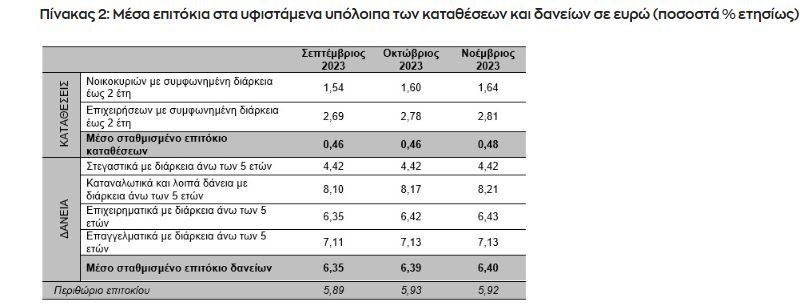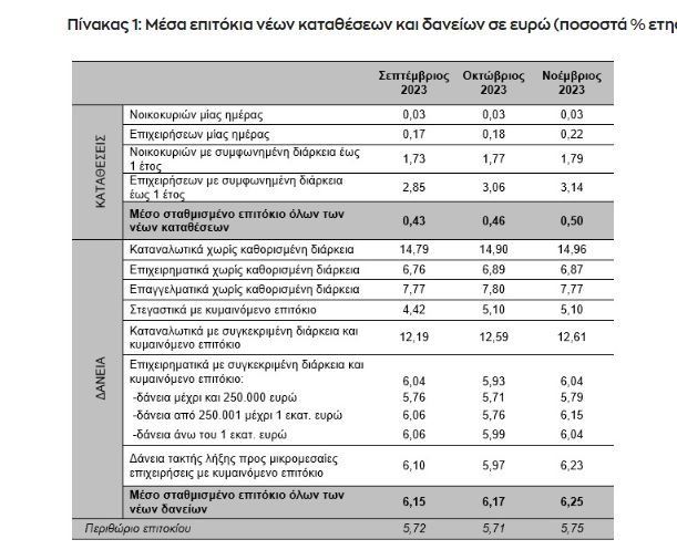 Το Νοέμβριο του 2023, τα μέσα σταθμισμένα επιτόκια των νέων καταθέσεων και νέων δανείων αυξήθηκαν στο 0,50% και 6,25% αντίστοιχα, σύμφωνα με την Τράπεζα της Ελλάδος.https://www.iefimerida.gr/tag/trapeza-tis-ellados