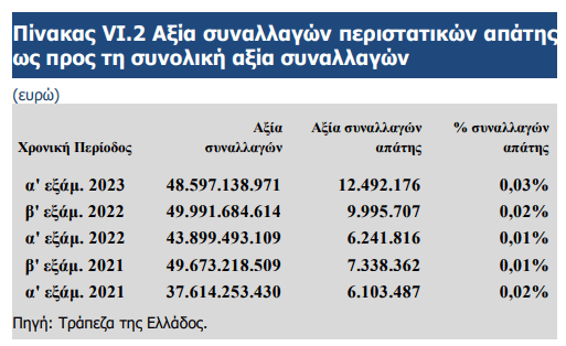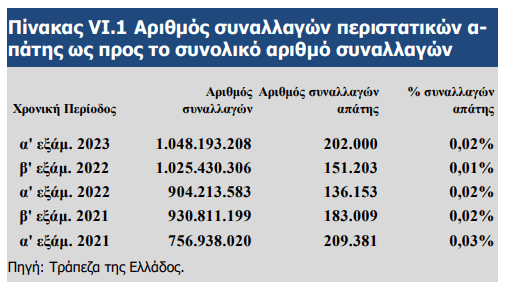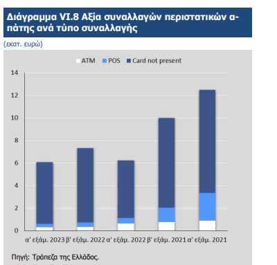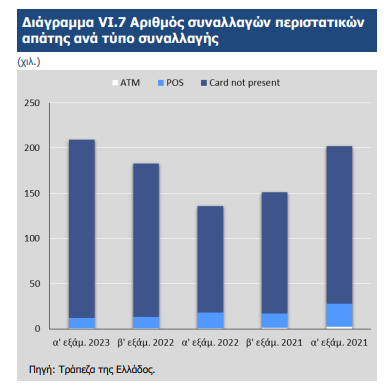 Ειδικότερα, το α΄ εξάμηνο του 2023, ο αριθμός των περιστατικών απάτης που καταγράφηκε ανά δίαυλο συναλλαγής ανήλθε σε 2.705 στις συναλλαγές ΑΤΜ, σε 26 χιλ. στις πληρωμές POS και σε 174 χιλ. στις συναλλαγές CNP. Η αντίστοιχη αξία των περιστατικών απάτης διαμορφώθηκε σε 900 χιλ. ευρώ στις συναλλαγές ΑΤΜ, σε 2,5 εκατ. ευρώ στις πληρωμές POS και σε 9εκατ.ευρώ στις συναλλαγές CNP.