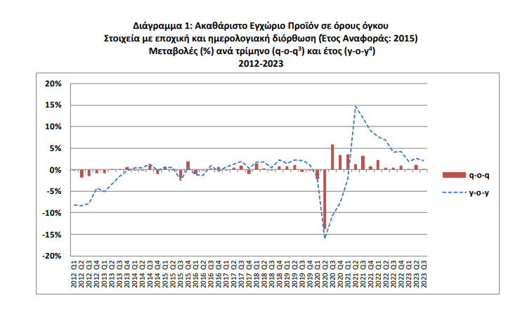 Με βάση τα μη εποχικά διορθωμένα στοιχεία το Ακαθάριστο Εγχώριο Προϊόν (ΑΕΠ) σε όρους όγκου, κατά το 3ο τρίμηνο 2023 παρουσίασε αύξηση κατά 1,8% σε σχέση με το τρίτο τρίμηνο 2022.