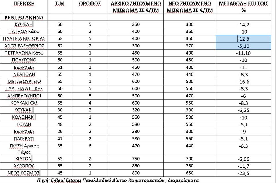 «Αξίζει να αναφέρουμε ότι σε πολλές περιπτώσεις-περιοχές του πίνακα, οι αρχικές ζητούμενες τιμές μίσθωσης ακόμη και σήμερα μετά τη μείωση των ζητούμενων τιμών μίσθωσης, αντιστοιχούν στο μηνιαίο έσοδο του εκάστοτε ιδιοκτήτη μέσω βραχυχρόνιας μίσθωσης», λέει στο ΑΠΕ-ΜΠΕ ο κ. Μπάκας. Γενικότερα, οι μειώσεις που καταγράφονται στις περιοχές του κέντρου της Αθήνας κυμαίνονται από 5% έως και 23,5%.