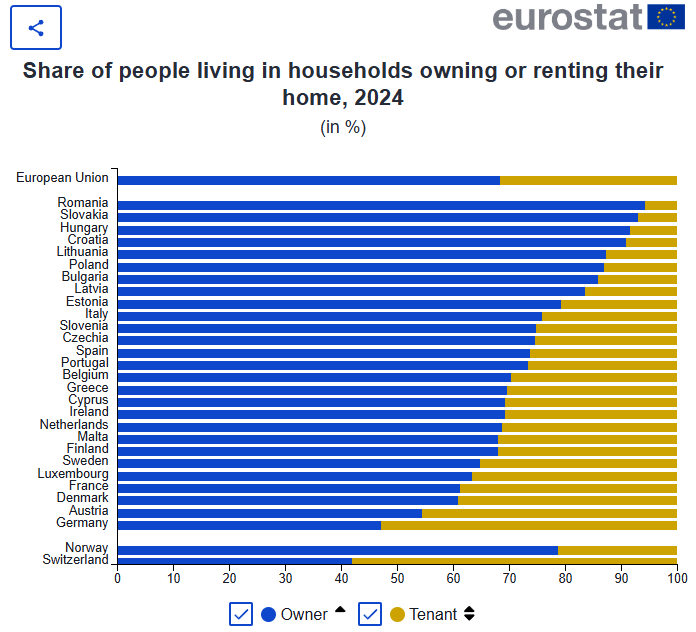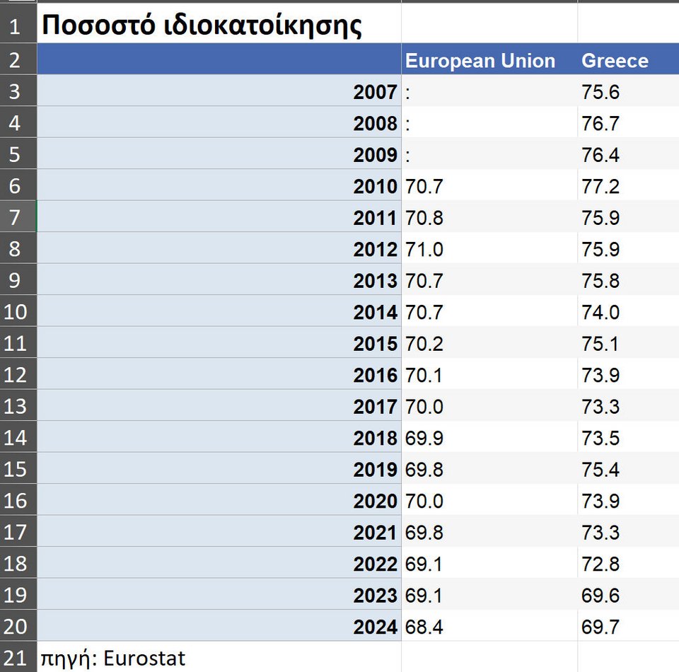 Και κάπως έτσι φτάσαμε στο ναδίρ της ιδιοκατοίκησης, καθώς πλέον το ποσοστό της βρίσκεται στο 69,7% των κατοικούμενων κατοικιών, που σύμφωνα με την τελευταία απογραφή είναι 4.319.144, με αποτέλεσμα η Ελλάδα να βρίσκεται κάτω από τη μέση της ευρωπαϊκής κατάταξης και χαμηλότερα από την Ισπανία και την Πορτογαλία.