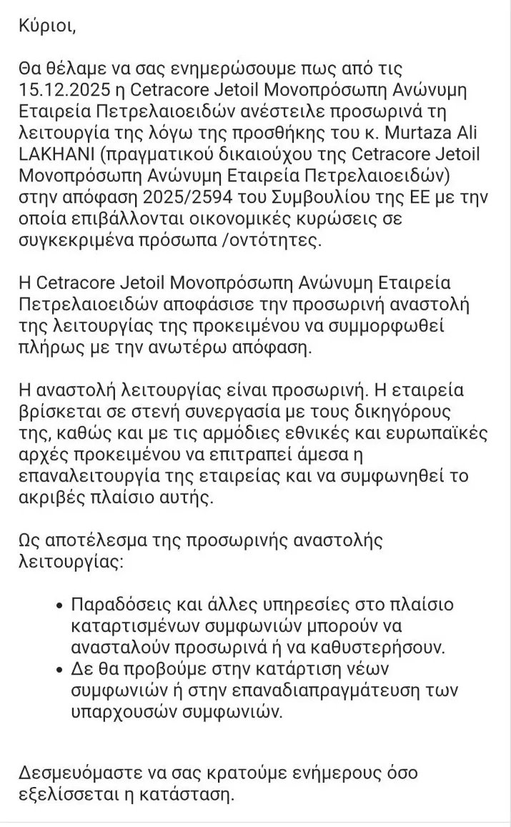 Αναστέλλεται η λειτουργία της JetOil μετά την αιφνιδιαστική απόφαση του Δ.Σ. Πώς το αιτιολογεί η εταιρεία.