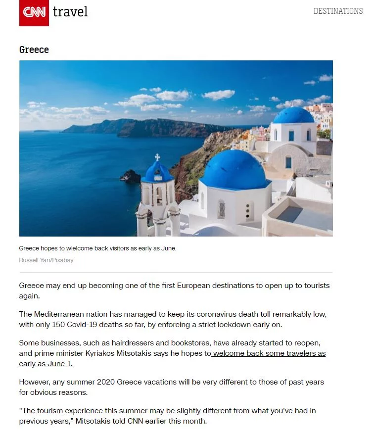 «Μπορεί η χώρα να ετοιμάζεται να υποδεχτεί ξανά τουρίστες, όμως θα αποδειχθεί πρόκληση για τους περισσότερους, να ταξιδέψουν. Προς το παρόν οι εκτός ΕΕ πολίτες, απαγορεύεται να μεταβούν στην Ελλάδα ως τις 18 Μαΐου, ενώ οι περισσότερες χαμηλού κόστους πτήσεις που συνεισφέρουν αρκετά στις διεθνείς αφίξεις στη χώρα, έχουν σταματήσει», συνεχίζει το άρθρο του CNN. «Παρόλα αυτά, ο κ.Μητσοτάκης, επενδύει σε ένα ρεύμα τουριστών υψηλού επιπέδου για την αναθέρμανση της τουριστικής βιομηχανίας της χώρας που απασχολεί έναν στους πέντε Έλληνες» καταλήγει.