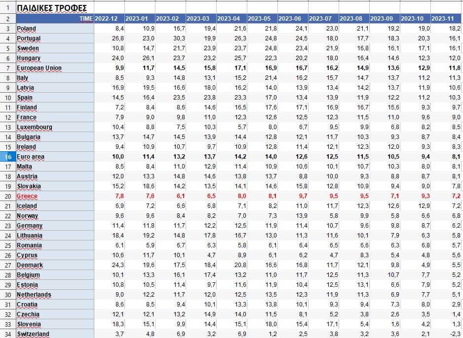 Η μέση αύξηση στην Ευρωζώνη τον περασμένο Νοέμβριο ήταν 8,1%, ενώ στην Ελλάδα οι τιμές “έτρεξαν” με 7,2%. Πολύ υψηλότερα βρίσκονται και οι 3 υπόλοιπες χώρες του Ευρωπαϊκού Νότου, δηλαδή η Πορτογαλία (16,1%), η Ιταλία (11,3%) και η Ισπανία (10,3%).