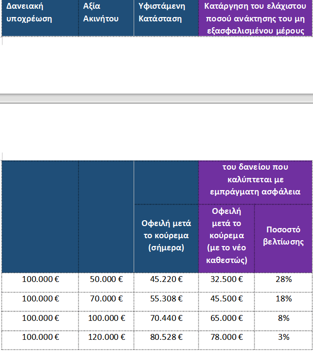- Παράδειγμα 2: για οφειλή ύψους 100.000 ευρώ με ακίνητο αξίας 70.000 ευρώ σήμερα η οφειλή μειώνεται στα 55.308 ευρώ ενώ με το νέο καθεστώς πέφτει στα 45.500, δηλαδή 18 % μικρότερη.