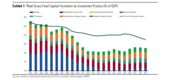 Μετά από χρόνια υποεπενδύσεων στην Ελλάδα, ο σχηματισμός ακαθάριστου κεφαλαίου (ως ποσοστό του ΑΕΠ) άρχισε να αυξάνεται σιγά-σιγά το 2020. Μετά την ένταξη της Ελλάδας στη ζώνη του ευρώ το 2001, το ποσοστό των επενδύσεων αυξήθηκε σε 24% κατά μέσο όρο μεταξύ 2001-2008. Ωστόσο, το δημόσιο χρέος και η παγκόσμια χρηματοπιστωτική κρίση οδήγησαν σε σημαντική πτώση των επενδυτικών ποσοστών, τονίζει ο διεθνής οίκος αξιολόγησης.