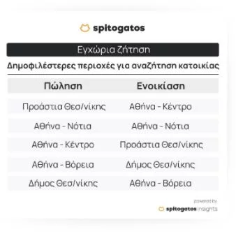 Οι πιο δημοφιλείς περιοχές για αναζήτηση κατοικίας προς ενοικίαση πανελλαδικά για το 2023 ήταν το κέντρο της πρωτεύουσας και τα Νότια Προάστιά της, ενώ ακολουθούν τα Προάστια της Θεσσαλονίκης, ο Δήμος Θεσσαλονίκης και τα Βόρεια Προάστια της Αθήνας.