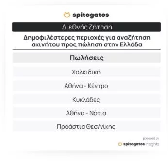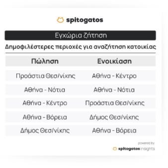 Οι πιο δημοφιλείς περιοχές για αγορά κατοικίας το 2023 πανελλαδικά ήταν τα Προάστια της Θεσσαλονίκης, τα Νότια Προάστια και το κέντρο της Αθήνας, τα Βόρεια Προάστια της Αθήνας και ο Δήμος Θεσσαλονίκης. Οι δημοφιλέστερες κατηγορίες κατοικιών προς πώληση για τους Έλληνες το 2023 ήταν οι μονοκατοικίες, τα διαμερίσματα και τα στούντιο.