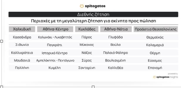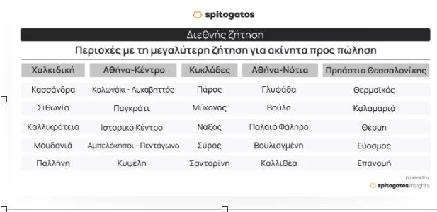 Εστιάζοντας στην περιοχή του κέντρου της Αθήνας, οι περιοχές που συγκέντρωσαν το μεγαλύτερο ενδιαφέρον είναι το Κολωνάκι-Λυκαβηττός, το Παγκράτι, το Ιστορικό κέντρο, η περιοχή Αμπελόκηποι-Πεντάγωνο και η Κυψέλη. Την πρωτιά στις Κυκλάδες παίρνει η Πάρος, σε ό,τι αφορά τη διεθνή ζήτηση ακινήτων προς πώληση το 2023, ενώ ακολούθησαν η Μύκονος, η Νάξος, η Σύρος και η Σαντορίνη.Στα προάστια της Θεσσαλονίκης, ο Θερμαϊκός, η Καλαμαριά, η Θέρμη, ο Εύοσμος και η Επανομή αποτέλεσαν τις δημοφιλέστερες περιοχές για αγορά ακινήτου για τους ενδιαφερόμενους από το εξωτερικό. Στα Νότια Προάστια της Αττικής, το ενδιαφέρον της διεθνούς ζήτησης για ακίνητα προς πώληση επικεντρώθηκε στη Γλυφάδα, τη Βούλα, το Παλαιό Φάληρο, τη Βουλιαγμένη αλλά και την Καλλιθέα.