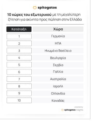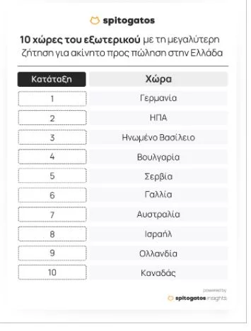 Αυξημένη κατά 5% σε σχέση το 2022 ήταν η διεθνής ζήτηση για ακίνητα προς πώληση στην Ελλάδα το 2023. Οι χώρες από όπου προήλθε το πιο έντονο ενδιαφέρον για αγορά ακινήτου στην Ελλάδα το 2023 είναι η Γερμανία, οι Ηνωμένες Πολιτείες της Αμερικής και το Ηνωμένο Βασίλειο, ενώ αξιοσημείωτη είναι η ζήτηση για αγορά ακινήτων που προέρχεται από γειτονικές χώρες των Βαλκανίων, όπως η Σερβία, η Βόρεια Μακεδονία αλλά και η Βουλγαρία.