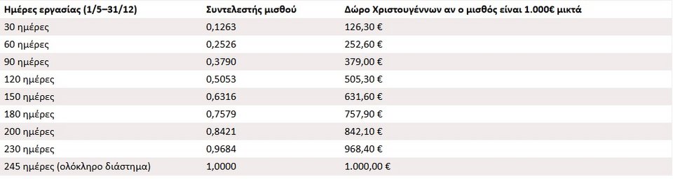 Για τον ακριβή υπολογισμό, ο νόμος δίνει αναλυτικό πίνακα με συντελεστές ανά ημέρα εργασίας. Πολλαπλασιάζεις τον μεικτό μισθό σου με τον αντίστοιχο συντελεστή και έτσι βρίσκεις το ποσό του Δώρου Χριστουγέννων 2025 που δικαιούσαι.