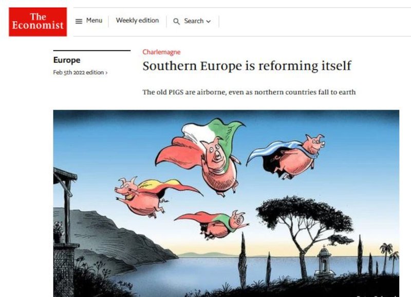 Οι χώρες της περιφέρειας, που σκωπτικά αποκαλούνταν στη διάρκεια της κρίσης χρέους “PIGS” (το ακρωνύμιο από τα αρχικά Portugal, Italy, Greece, Spain) σήμερα πετούν ψηλά δίνοντας το παράδειγμα στους βόρειους γείτονές τους με τον μεταρρυθμιστικό τους ζήλο, σημειώνει ο Economist.